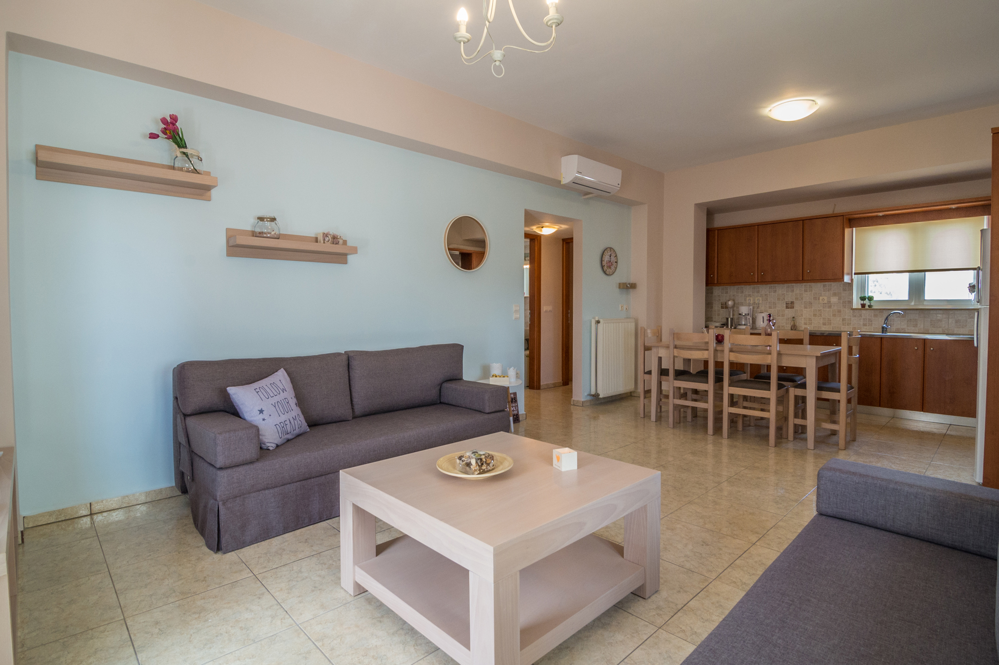 Τα διαμερίσματά μας είναι κομψά επιπλωμένα και ευρύχωρα, παρέχοντάς σας μια άνετη και ξεκούραστη διαμονή. Εξοπλισμένα με δωρεάν Wi-Fi, δορυφορική τηλεόραση 43″, κλιματισμό και θέρμανση, διαθέτουμε όλα όσα χρειάζεστε για να κάνετε τη διαμονή σας ευχάριστη.